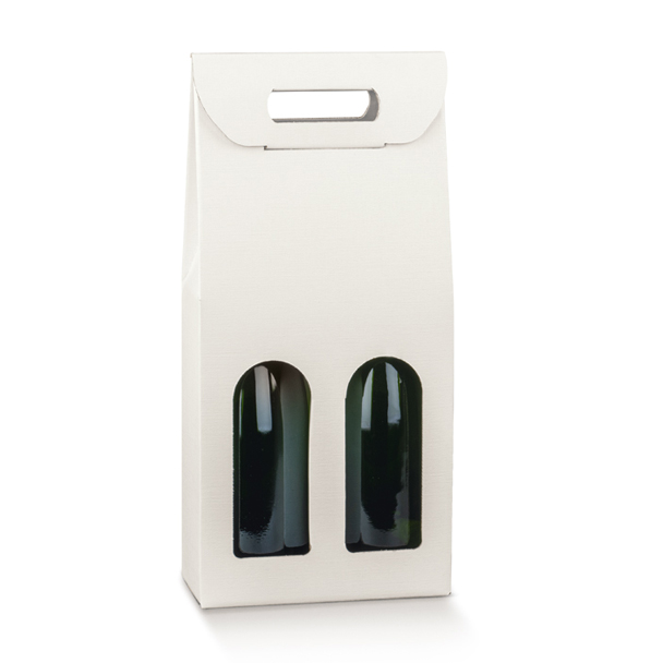 Caixa para 2 garrafas em cartão micro canelado, revestido a tela texturada branca